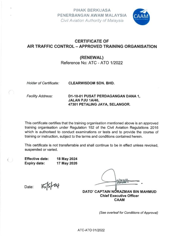 CAAM — ATC Approved Training Organisation Certificate Issued by the Civil Aviation Authority of Malaysia (CAAM), this certificate recognises Clearwisdom Sdn. Bhd. as an authorised Approved Training Organisation for Air Traffic Control, permitted to conduct ATC training courses and examinations in compliance with the Civil Aviation Regulations 2016.