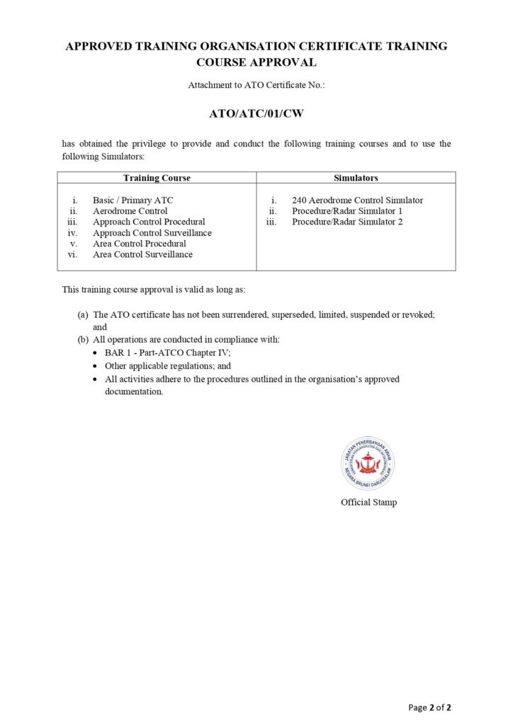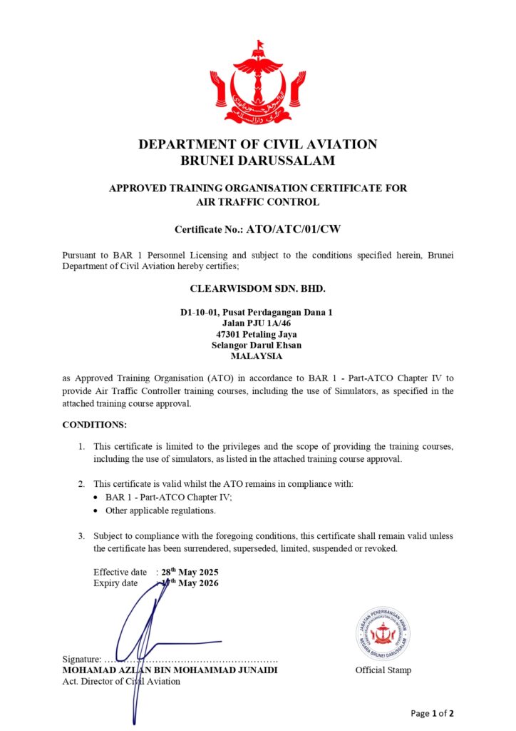 Brunei DCA — ATC Approved Training Organisation Certificate Issued by the Department of Civil Aviation, Brunei Darussalam, this certificate authorises Clearwisdom Sdn. Bhd. to deliver a full range of Air Traffic Control training programmes, including the use of advanced simulators, in accordance with BAR 1 – Part-ATCO Chapter IV regulations.