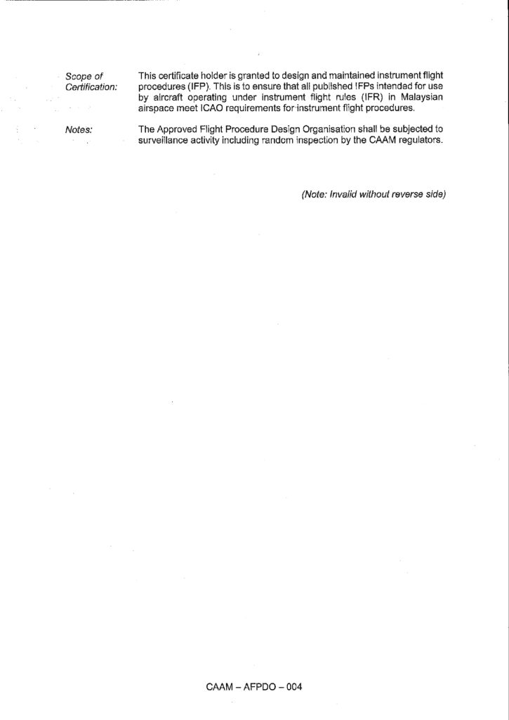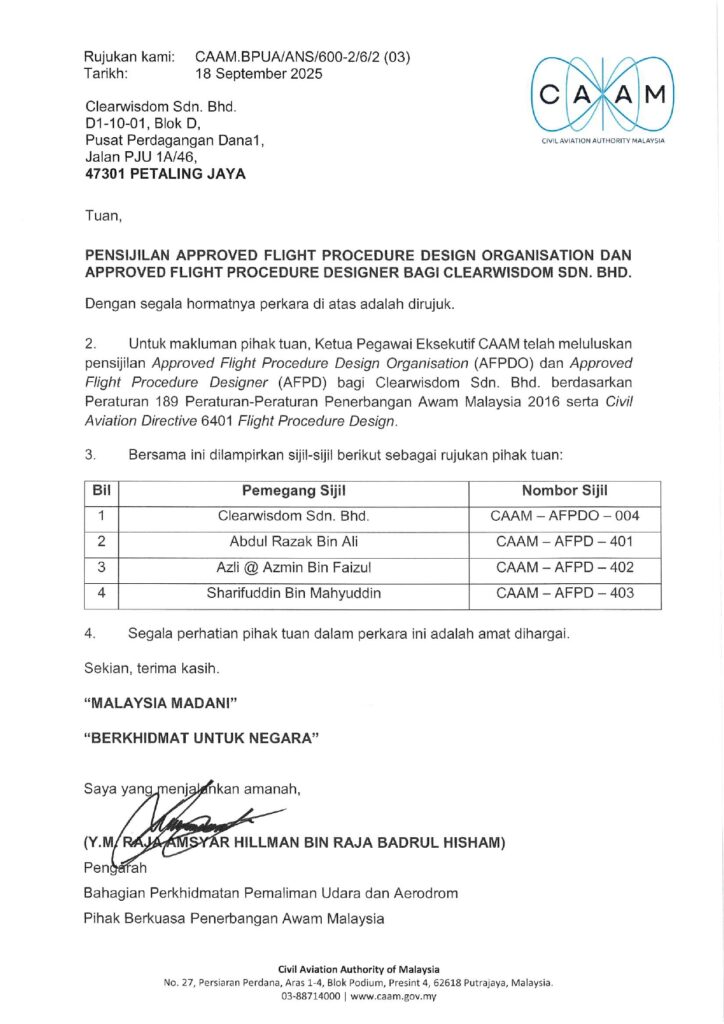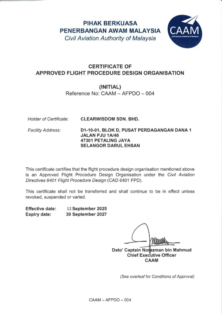 In addition, Clearwisdom is also certified as an Approved Flight Procedure Design Organisation (AFPDO) by CAAM, authorised to design and maintain Instrument Flight Procedures (IFP) in Malaysian airspace in compliance with ICAO standards.
