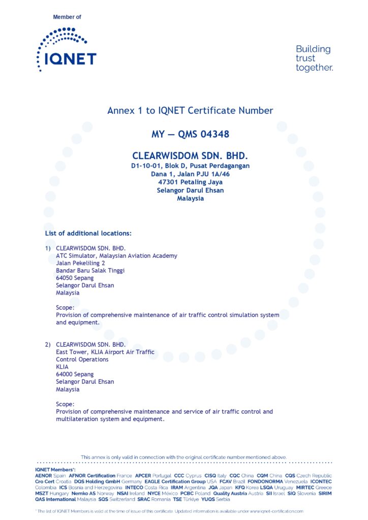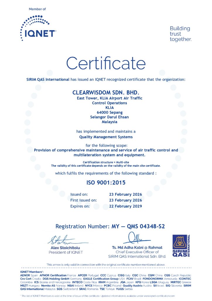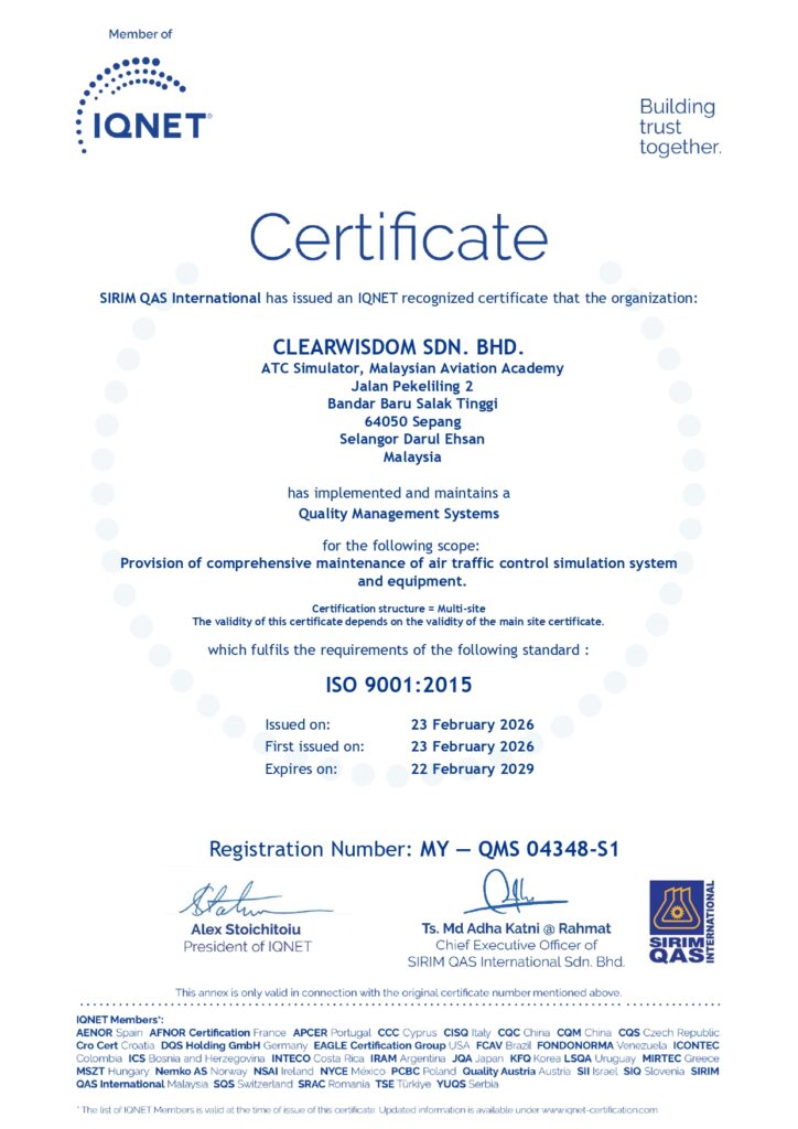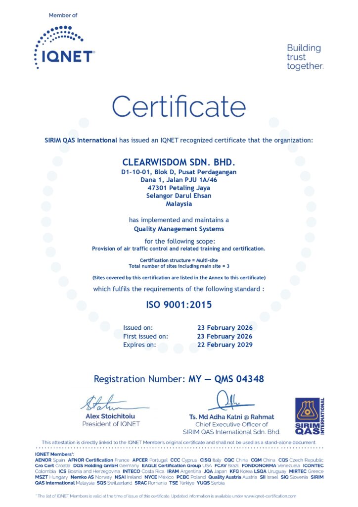 Clearwisdom Sdn. Bhd. is certified to ISO 9001:2015 by SIRIM QAS International, recognised under the IQNET international certification network. This certification confirms that Clearwisdom has implemented and maintains a Quality Management System across all three of its operational sites — covering the provision of air traffic control training and certification, comprehensive maintenance of ATC simulation systems and equipment, and maintenance and service of ATC and multilateration systems at KLIA. This achievement reflects Clearwisdom’s commitment to delivering consistent, high-quality services that meet international standards.
